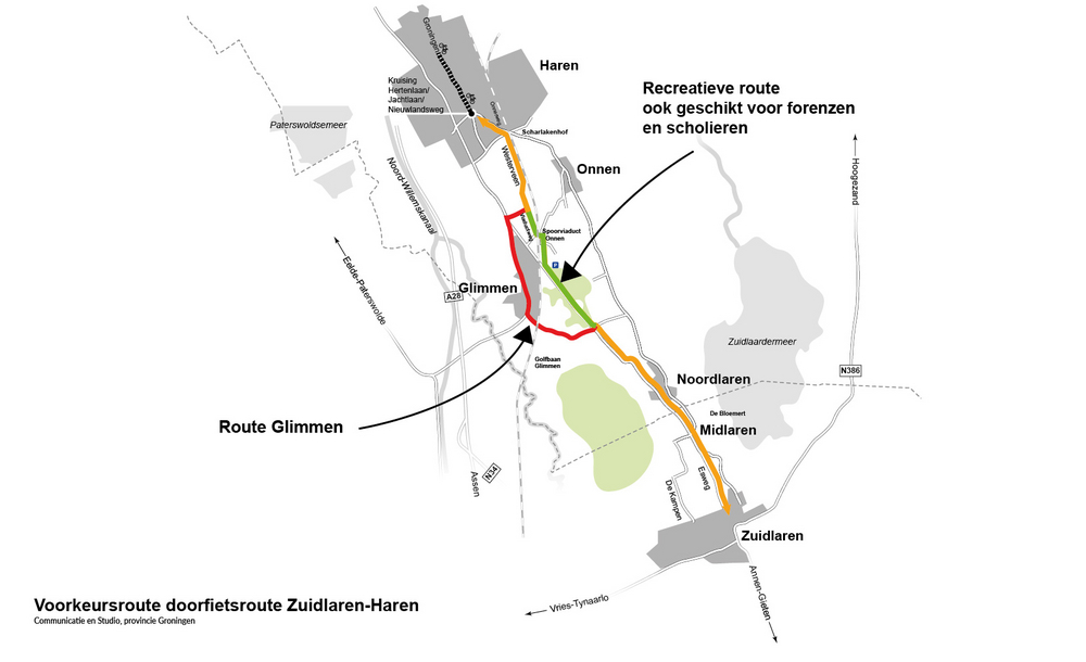 - Een altijd toegankelijke route via de Rijksstraatweg en Zuidlaarderweg. Deze route is goed verlicht en wordt gestrooid en geveegd.