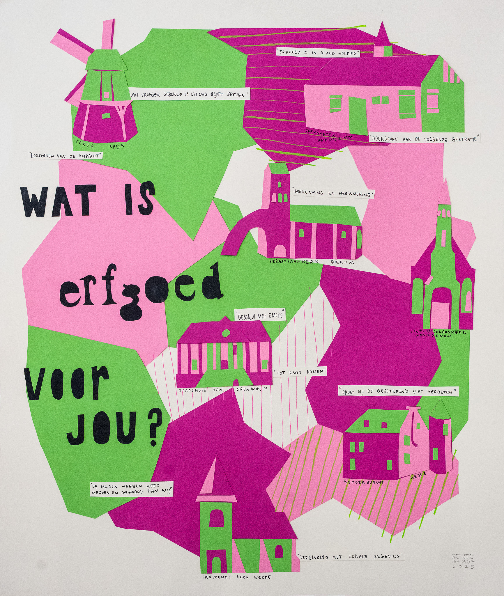 Onderweg vroegen we mensen: “Wat betekent erfgoed voor jou?” De antwoorden waren verrassend, ontroerend en soms heel persoonlijk. Bente had haar schetsboek bij zich en legde niet alleen woorden, maar ook indrukken vast. Samen verzamelden we quotes en verhalen, die Bente later omtoverde tot een kleurrijk kunstwerk in echte Erfgoedlab-stijl: dynamisch, vol verbeelding, en een ode aan het erfgoed en landschap van Groningen.