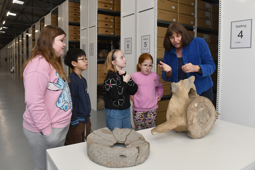 Vanmorgen is groep 8 van CBS De Regenboog uit Hoogezand op bezoek in Nuis. In twee groepen worden de leerlingen langs de vondsten geleid. Vrijwilliger Carla van der Zwaan laat de kinderen verschillende aardewerken potten zien. De kinderen moeten raden waarvoor de potten gebruikt werden. Aan de overgebleven resten in de potten is te zien welk doel ze dienden.