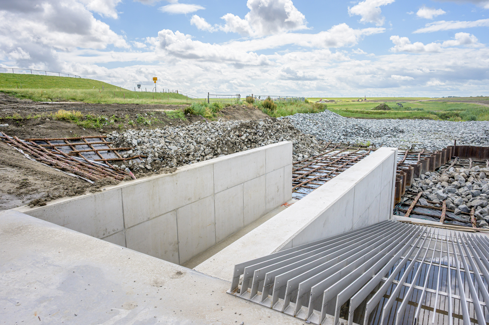 Het betonwerk voor de bouw van de doorlaatduiker is inmiddels klaar. Ook zijn de voorzieningen voor de in- en uitstroom van water gebouwd. Een rooster in de duiker moet voorkomen dat bijvoorbeeld takken met het zoute water het proefgebied voor zilte teelt instromen. Ook zijn rondom de doorlaatduiker stenen gestort om de bodem te beschermen tegen erosie.