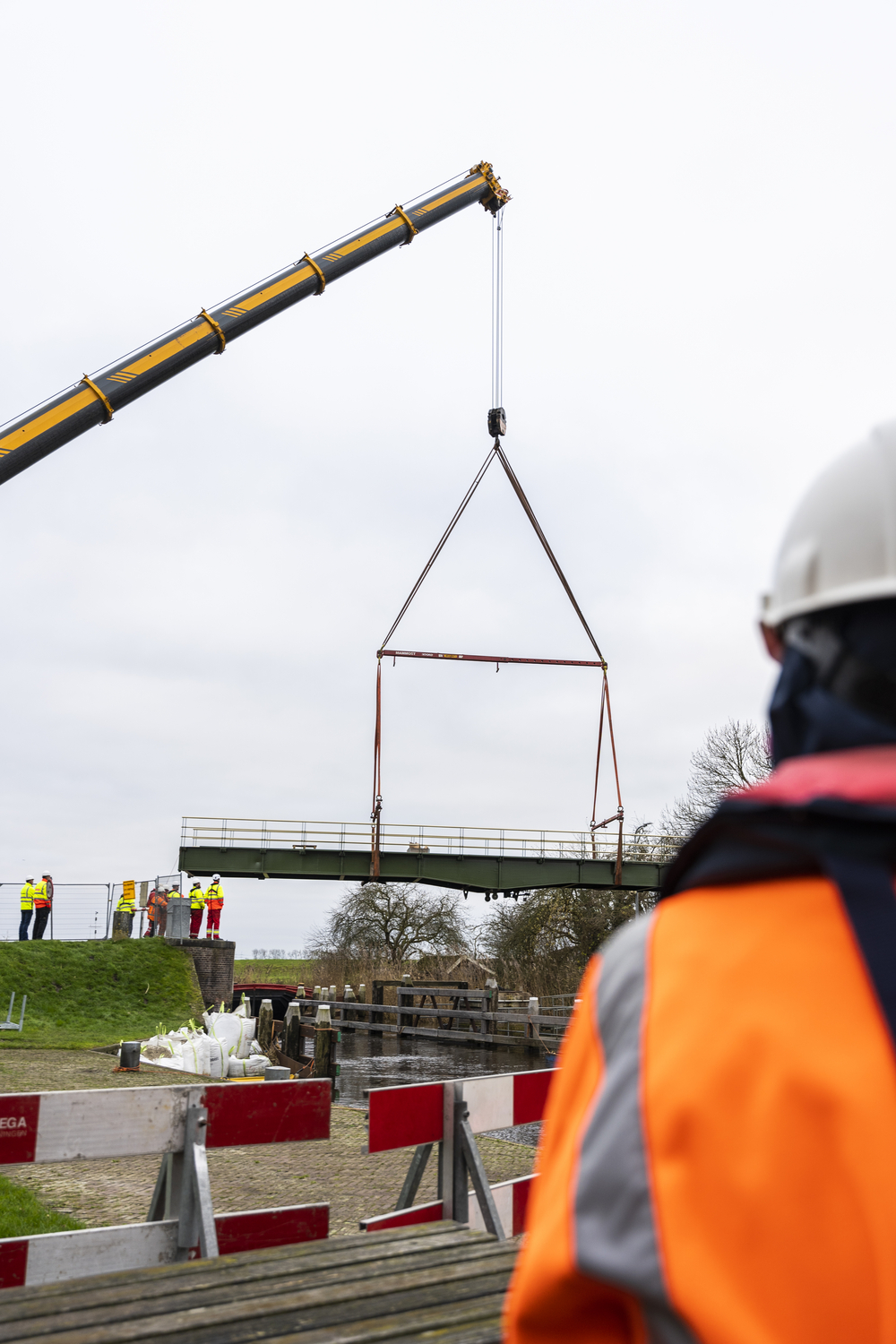 Het brugdek werd op 9 december op een ponton aangevoerd vanuit Groningen. Vanaf machinefabriek Rusthoven voer de boot via het Winschoterdiep en Reitdiep naar de locatie. Daar stond een grote kraan klaar om de circa 35 ton zware brug op de plek te takelen. Zie ook onze korte verslaglegging op YouTube.
