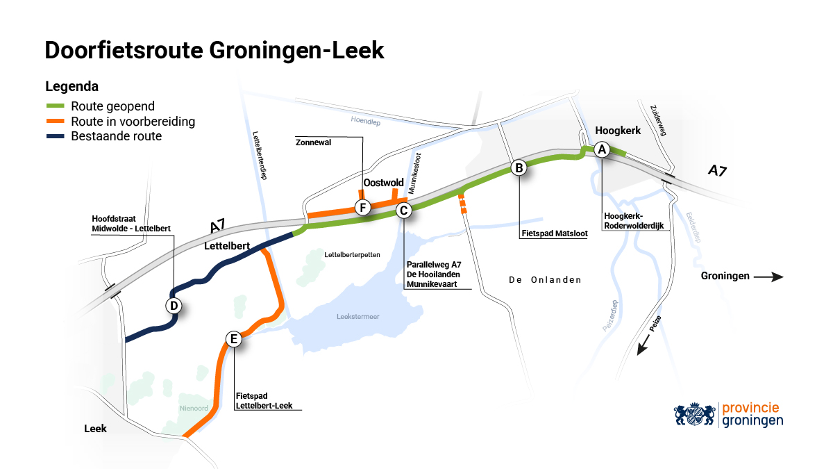 De vernieuwde fietsroute is onderdeel van de Doorfietsroute tussen Leek en Groningen. De officiële opening van de doorfietsroute staat in het voorjaar van 2026 op de planning. Dan moet het ontbrekende deel, tussen Nienoord en Lettelbert langs het Leekster Hoofddiep, klaar zijn. In 2024 werd het eerste deel van de Doorfietsroute, de Hoofdstraat tussen Midwolde en Lettelbert, geopend.