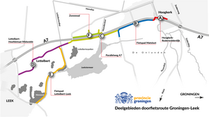 De nieuwe Doorfietsroute komt ten zuiden van de A7. Op delen van de route komt een nieuw fietspad en op stukken van de route gaan we het bestaande fietspad verbeteren. Ter hoogte van de Lettelberterplas kun je als fietser dan op twee manieren Leek binnen rijden. Ter hoogte van Oostwold loopt het fietspad een gedeelte parallel aan de A7. De planning is dat eind 2024 de hele route, aan de zuidkant van de A7, klaar is.