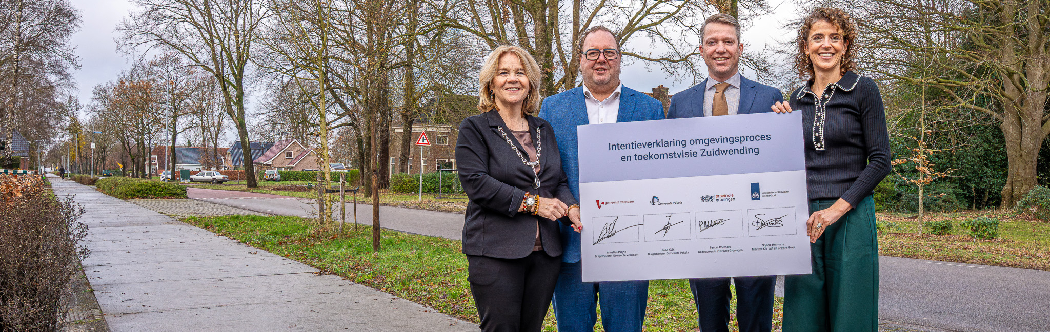 Minister Sophie Hermans van Klimaat en Groene Groei, gedeputeerde Pascal Roemers van de provincie Groningen, burgemeester Jaap Kuin van Pekela en burgemeester Annelies Pleyte van Veendam waren vandaag in het gebied aanwezig om hun handtekening onder de intentieverklaring te zetten.
