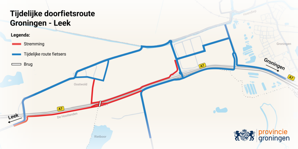 Fietsers vanuit Leek worden vanaf de Hoofdstraat omgeleid via Oostwold en Vierverlaten (noordzijde van de A7). Fietsers vanuit Roderwolderdijk/Hoogkerk richting Leek kunnen de omgekeerde route fietsen. De omleidingsroute wordt ook met borden aangegeven.