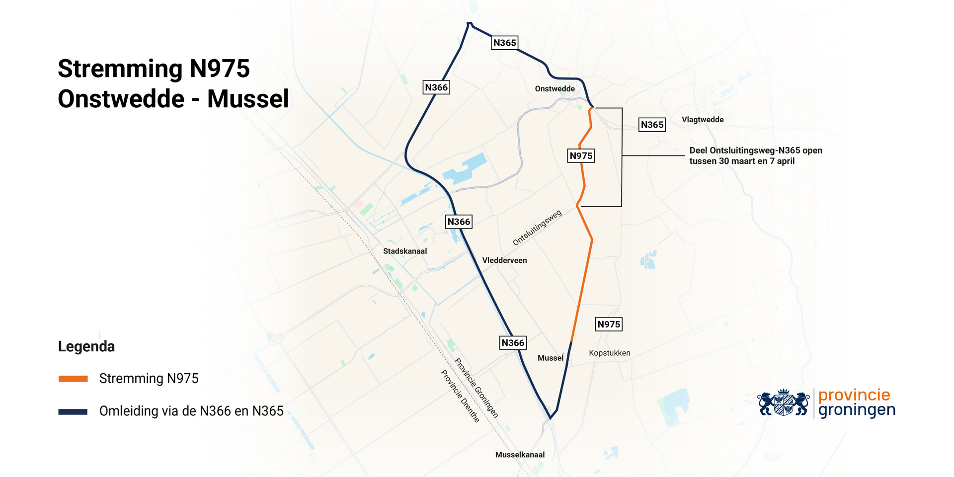 De werkzaamheden vinden plaats in twee fasen. Van 30 maart tot 7 april is de weg afgesloten van de komgrens van Mussel tot de Ontsluitingsweg. Het deel van de N975 ten noorden van de Ontsluitingsweg blijft toegankelijk. Van 7 april tot en met 24 april is de weg volledig afgesloten van de komgrens van Mussel tot de kruising met de N365 bij Onstwedde.