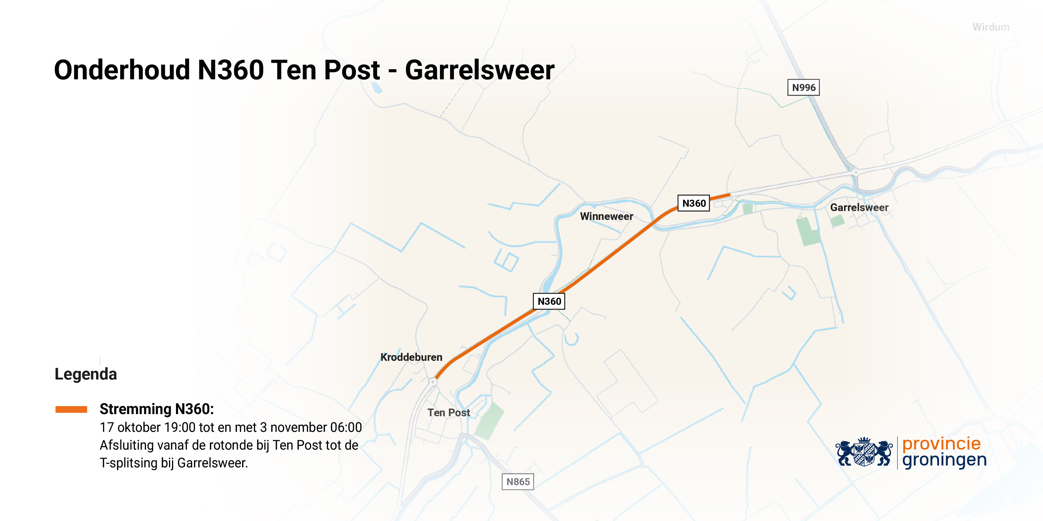 Tijdens de werkzaamheden is de N360 vanaf de rotonde bij Ten Post tot aan de t-splitsing bij Garrelsweer volledig afgesloten voor gemotoriseerd verkeer. Doorgaand verkeer tussen Ten Post en Garrelsweer kan omrijden via Loppersum (N996), de Eemshavenweg (N46) en Sint Annen (N993). De omleidingsroutes staan met borden aangegeven. Automobilisten moeten rekening houden met extra reistijd. De werkzaamheden zijn nodig om de wegkwaliteit te verbeteren en de verkeersveiligheid te vergroten.