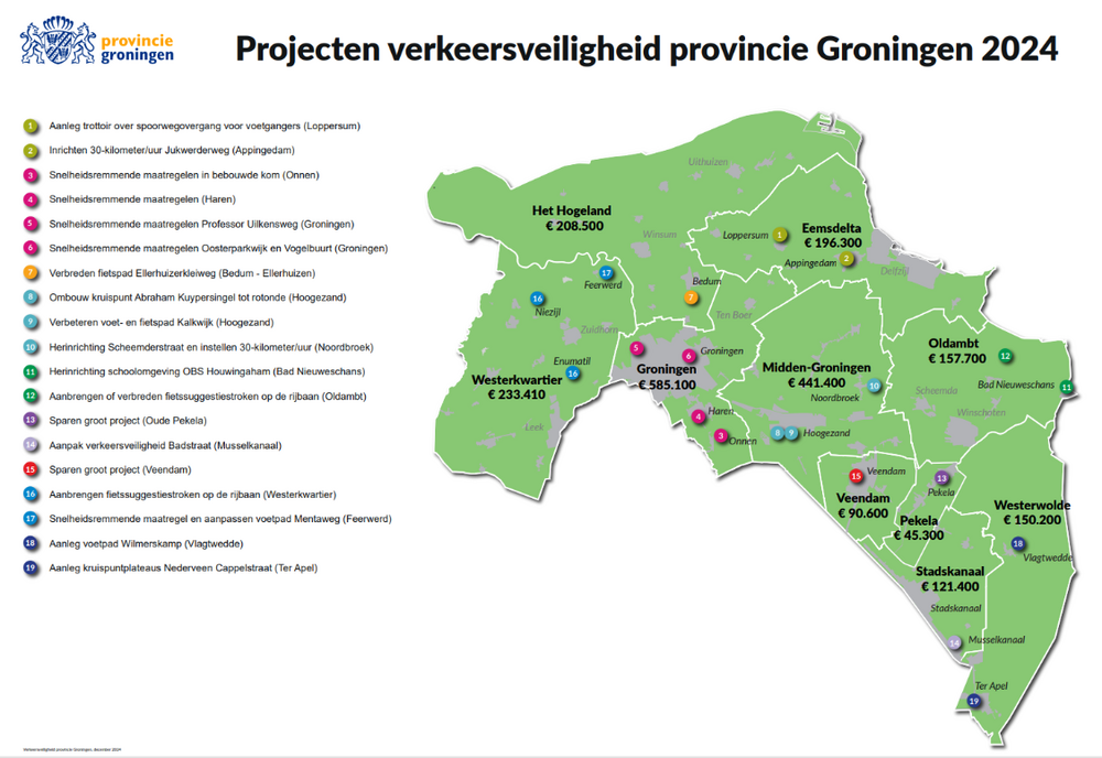 De meeste gemeenten nemen maatregelen om de snelheid van autoverkeer terug te dringen in de bebouwde kom. Bijvoorbeeld door de weg anders in te richten of door de maximumsnelheid te verlagen naar 30 kilometer per uur. Ook voor fietsers is veel aandacht, met nieuwe fietsoversteken, bredere fietspaden en een duidelijke plek voor de fiets op de rijbaan. Rond de basisschool in Bad Nieuweschans wordt een onveilige verkeerssituatie aangepakt. De gemeenten Pekela en Veendam sparen voor een groot project dat later wordt uitgevoerd.