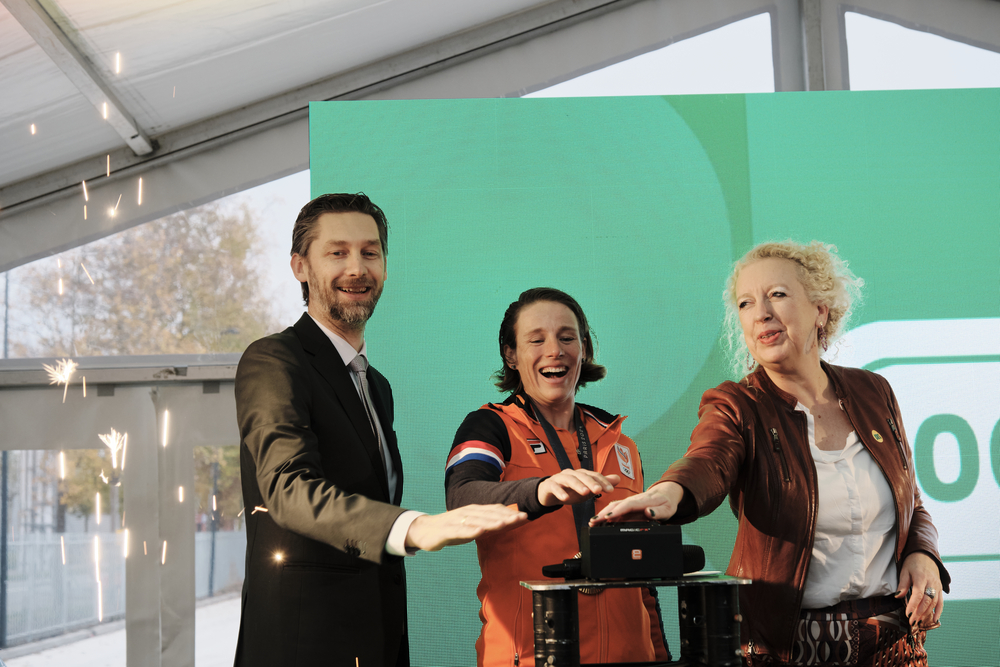 Met een symbolische druk op de knop openen Johan Hamster, Marloes Oldenburg en Rosalinde Hoorweg de ‘Busstalling van de Toekomst’ aan de Peizerweg.