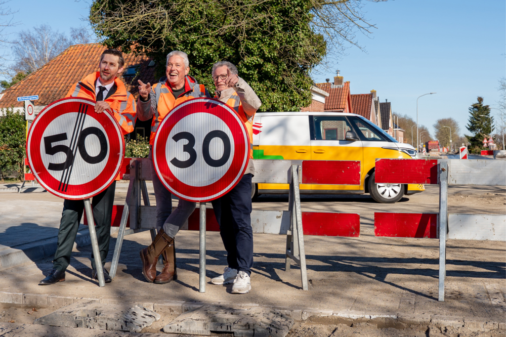 Gedeputeerde Johan Hamster en wethouder Markus Ploeger zijn aanwezig bij de herinrichting van de Scheemderstraat in Noordbroek.