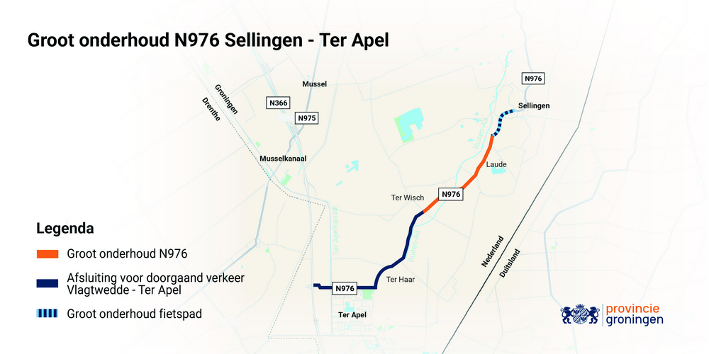 Het werk in september en oktober is de eerste fase van de werkzaamheden aan de N976. Het groot onderhoud tussen de Borgerschapenweg en de bebouwde kom van Sellingen en tussen de Schaalbergerweg en Ter Apel, wordt in het voorjaar van 2026 uitgevoerd (fase 2 & 3).