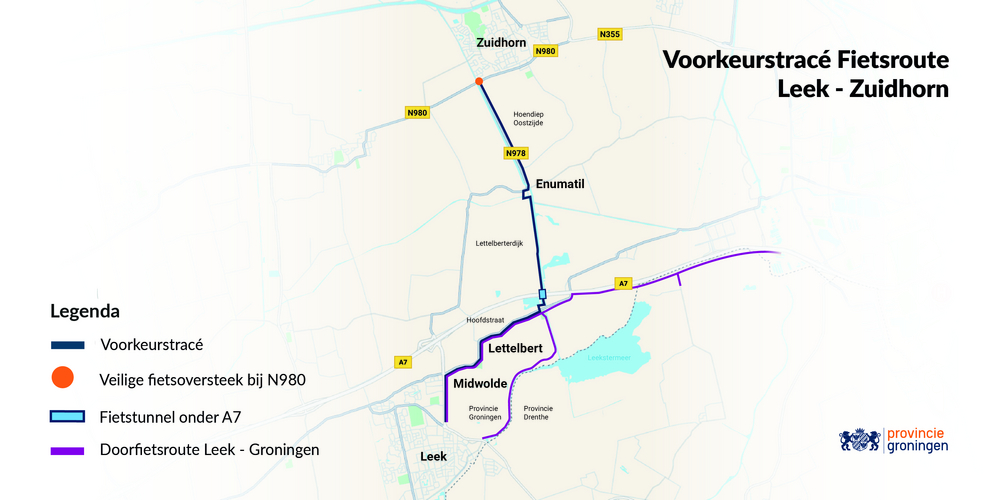De beoogde route tussen Zuidhorn en Leek volgt voor een groot deel het Hoendiep en Lettelberterdiep. Bij de Fanerbrug, ten zuiden van Zuidhorn, komt een veilige oversteek voor fietsers bij de kruising met de Fanerweg (N980). Langs het Hoendiep Oostzijde komt een vrijliggend fietspad tot aan Enumatil. Het fietspad langs de Lettelberterdijk, tussen Enumatil en Lettelbert, wordt verbeterd en verbreed. Fietsers kunnen vervolgens via een tunnel onder de A7 door, waarna het fietspad aansluit op de Hoofdstraat bij Lettelbert. De Hoofdstraat is onderdeel van de Doorfietsroute Leek - Groningen.