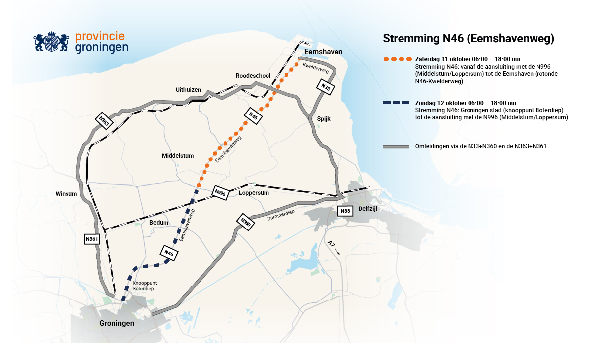 Zaterdag 11 oktober is de N46 vanaf 06.00 uur afgesloten vanaf de oostelijke op- en afrit naar Middelstum/Loppersum (N996) tot aan de Eemshaven (rotonde N46-Kwelderweg). Zondag 12 oktober is de N46 vanaf 06.00 uur afgesloten vanaf Groningen stad (knooppunt Boterdiep) tot aan de westelijke op- en afrit Middelstum/Loppersum (N996).
